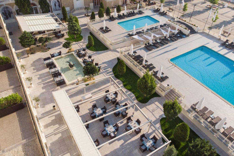 - Piscina exterioara cu masute si umbrele